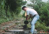 荷物や装備の点検をして7時半に出発。しばらくはトロッコの枕木の上を、渓谷沿いに奥へ奥へと入っていく。川を右手に見ながらしばらく進むと、40分ほどで小杉谷の鉄橋に到着する。ここで川を大きく横切る。トロッコの鉄橋なのでもともと人が渡るようにはできていない。欄干も手すりもない。下も丸見え。しかし鉄橋から見る川の眺めはなかなかのものである。川に散在するごつごつした大きな石が高さの加減で小さく見える。さすがに台風通過直後だけあって、川はものすごい量の水を吐き出していた。